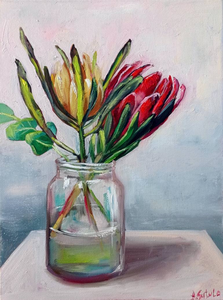Still life with Proteas Inspired by beautiful flowers from a local florist. Please feel free to contact me to order a similar painting in another size. Certificate of Authenticity included.