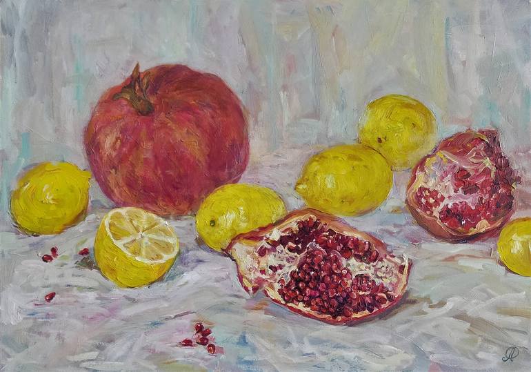 I really like the combination of bright fruits, so I wrote this still life from nature. I painted this still life quickly, forming the shape in large strokes and conveying all the beauty of the fruits. Bright pomegranates and yellow lemons will look good in the dining room, cafe or restaurant.. By p...