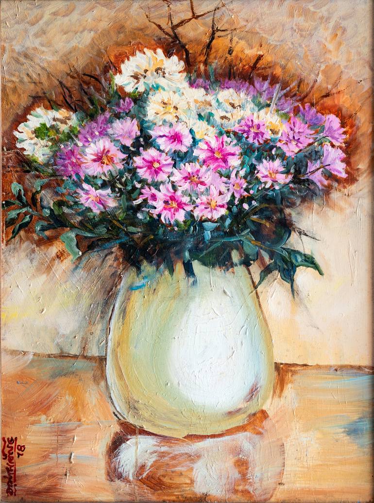 Still life with purple daisies. Material: Oil painting / Oil on canvas. Size: 60 x 80 cm. Year of creation: 2018