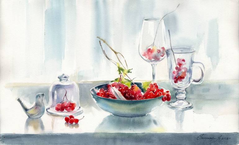 Still life with red berries. Watercolor. Paper. This is a winter, clear, lush still life. Red berries combine very beautifully with white transparent glass, gray-blue shadows and unusual winter light. The porcelain bird symbolizes the freedom of the soul and it is like a talisman in my paintings. ...