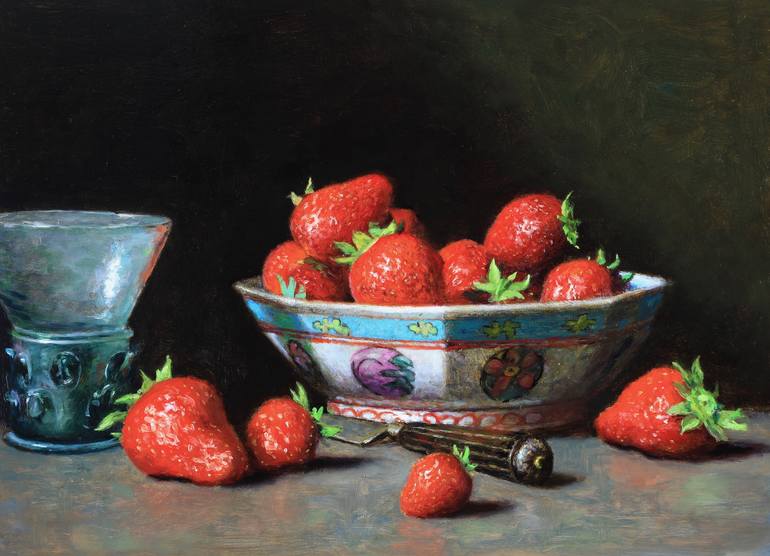 Inspired by 17 th Dutch Old Masters. The strawberries represent the transience of life, taste in contrast the old non organic items like the 17th century Berkenmeyer glass and the Italian Renaissance knife or antique Chinese bowl.