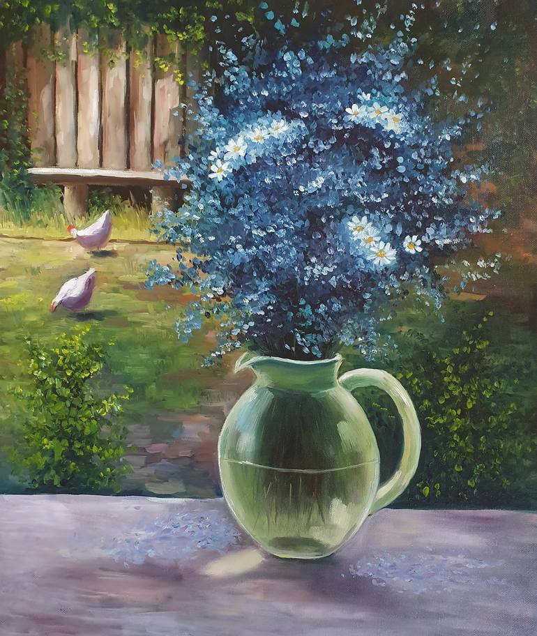 Still life with wildflowers in a glass jar in country style in blue and green colors. Such a still life will decorate the interior of the dining- or living room in any traditional and classic style, such as Rustic, Country, Provence, or Scandinavian style. This painting, as a finishing touch, can m...