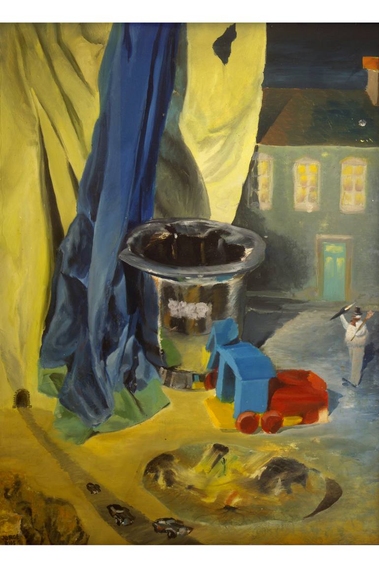 This is a still life oil painting from 1991. You can see a surreal winter scene and a missile almost airborne