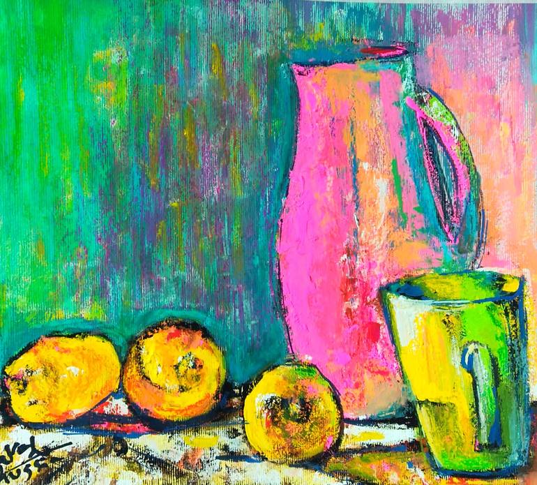 It's a painting of a still life of lemon and cups.