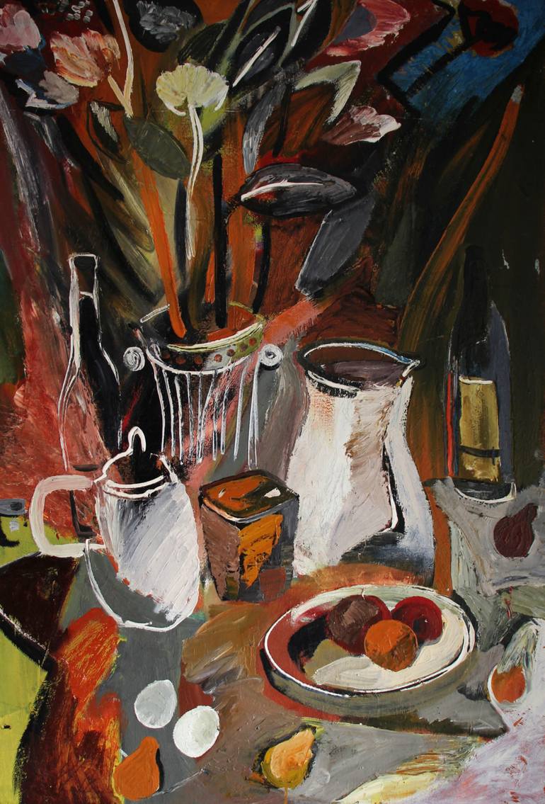Rustic still life is made in warm gray-brown tones. Uncomplicated food on the table - eggs, fruits, milk in a jug, bread ... The evening mood is created by garden flowers in a vase and a piece of blue sky in the window in the right corner of the canvas. Perfect for a dining room, cafeteria, restaura...