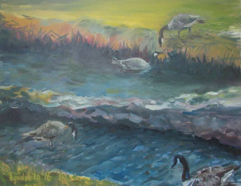 This is original oil painting made just before our park was reconstructed. The imperfect and broken paths created puddles where visiting geese found their place. It is farmed and ready to hang.