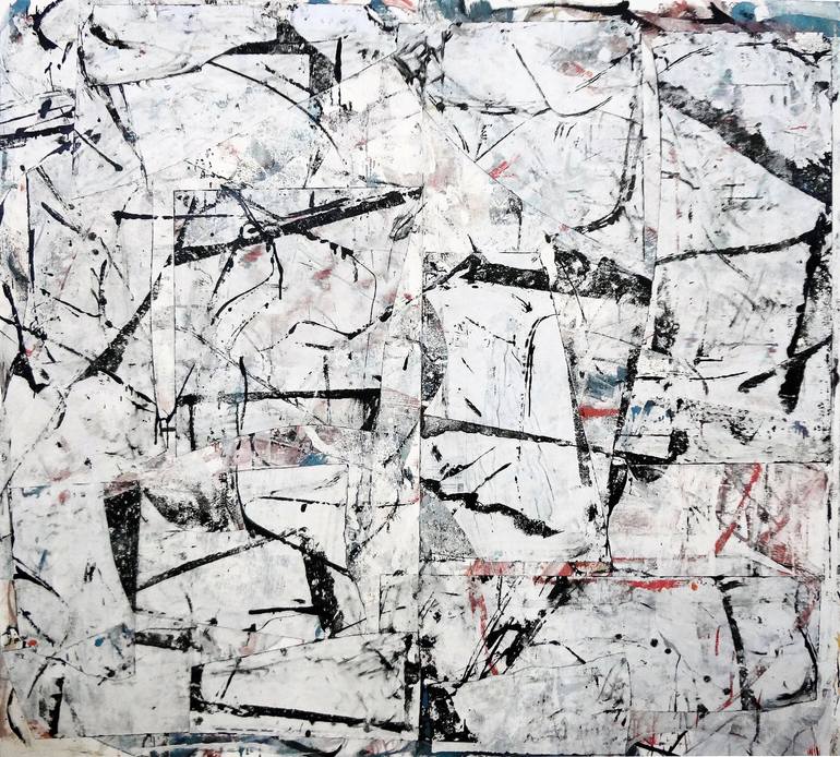 Gestural abstraction with collage elements on stretched canvas. Ships in a crate with hardware included.