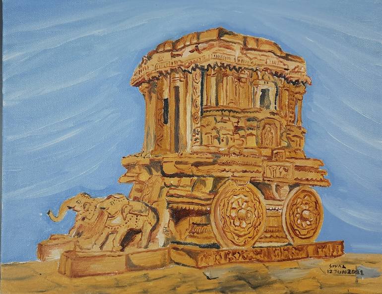 Inspired from the existing Stone Chariot at Hampi,India. oil on a 14 x 11 inch hand made canvas. canvas board made using 3mm MDF wooden sheet and pre-coated canvas cloth . Symbol of Karnataka state,India