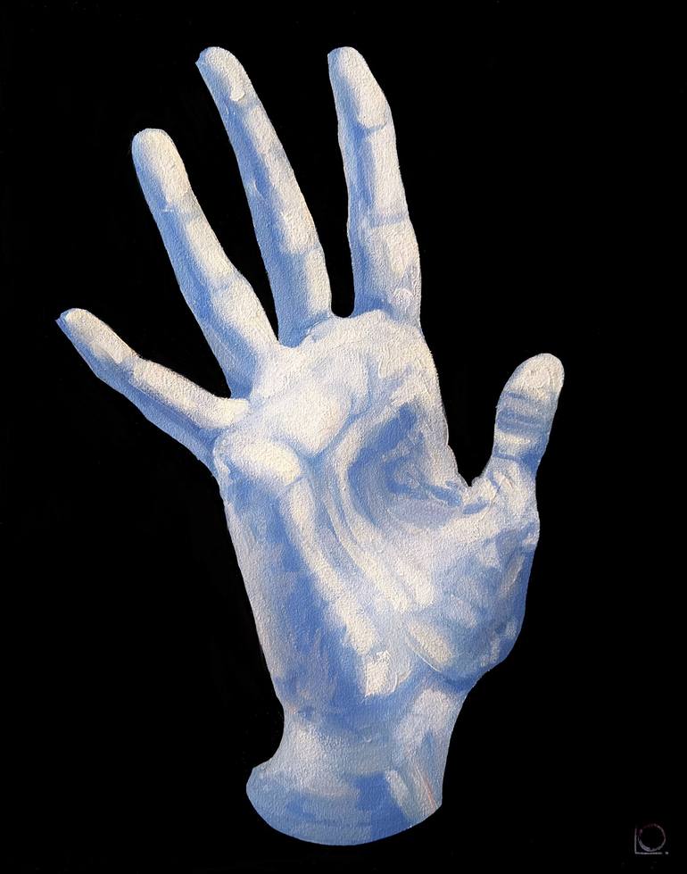 The painting ‘Stop’ symbolises the power of internal control and the call to stop or reflect. The black background depicts a blue hand raised in a stop gesture. The black background enhances the drama and adds depth to the work, creating a contrast with the blue colour, which is associated with cool...