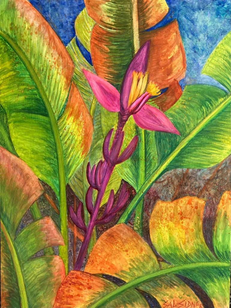 This watercolor and encaustic wax painting on birch board glows with the vibrant energy of the tropics. I spent a day cutting and trimming banana plants after a big Miami storm at Fairchild Tropical Gardens. Afterwards I painted this and applied layers of encaustic.
