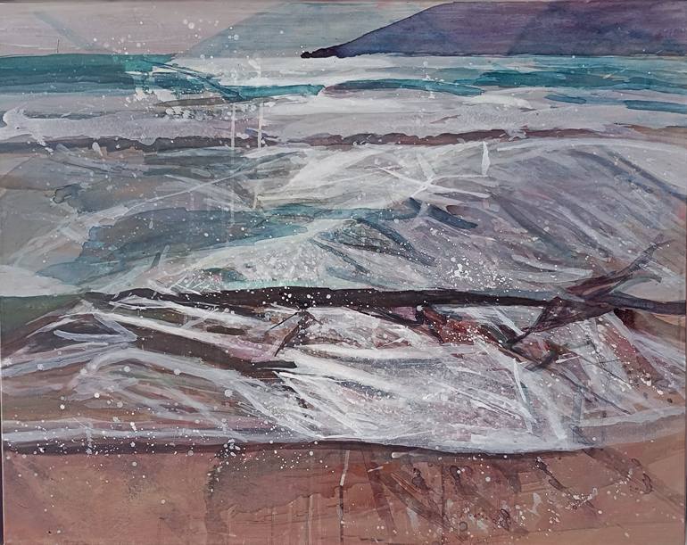 Inspired by the energy of the storm Shapes and rhythmic patterns of the waves and light. Liquid paint in driving marks is used to capture iridescent reflections of light on water