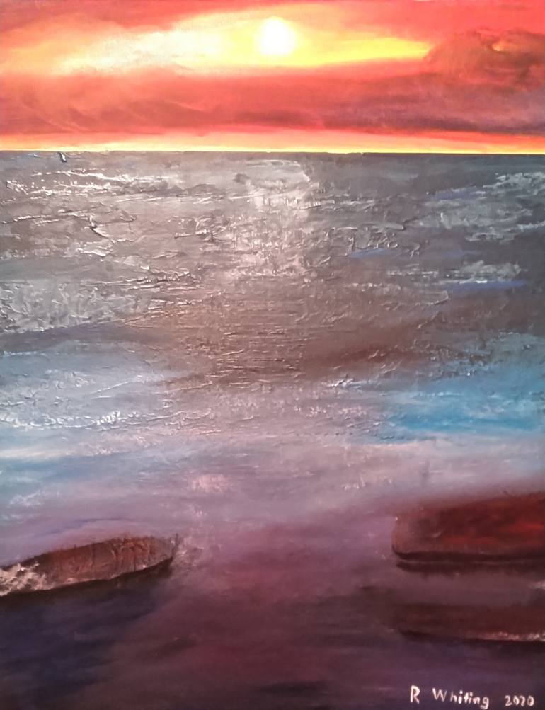 I am trying to express my feelings of calm while anticipating a storm on the horizon. I use a mixture of brushes and pallet knives to get the textures that I want to achieve.