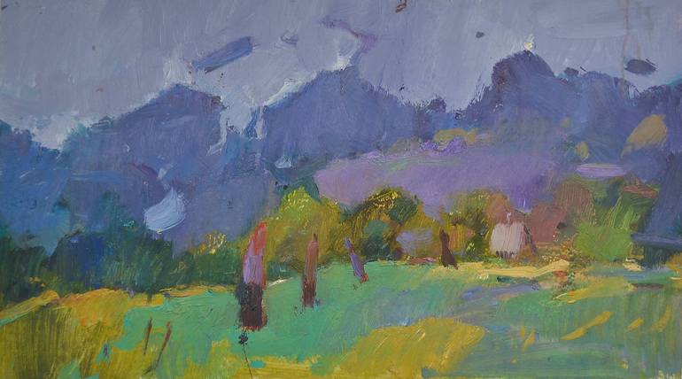 Vibrant hues of green and purple dominate a tranquil landscape scene featuring rolling hills and distant mountains beneath a muted sky. Trees dot the foreground, adding depth and contrast to the natural setting.