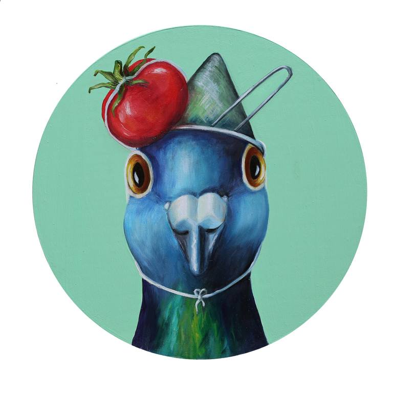 This painting is from a series of chef pigeons at work in the kitchen.