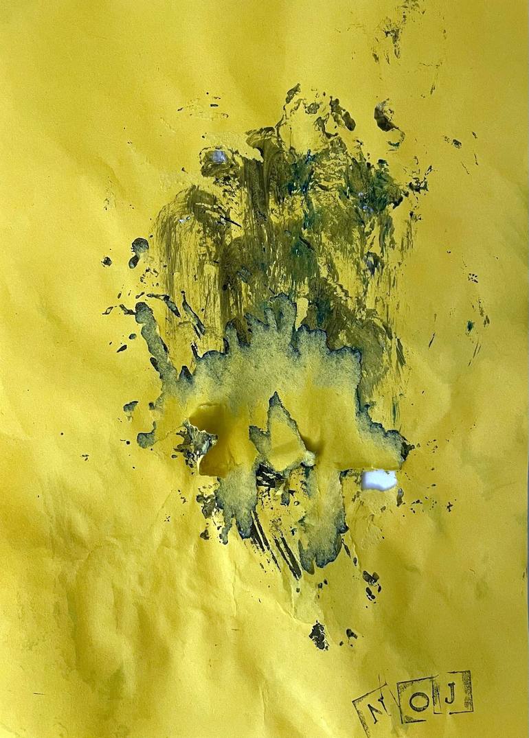 L'opera è una rappresentazione astratta di un'altra dimensione. Il foglio di carta giallo è sfondato e vuole rappresentare cosa c'è "dietro la facciata delle cose".