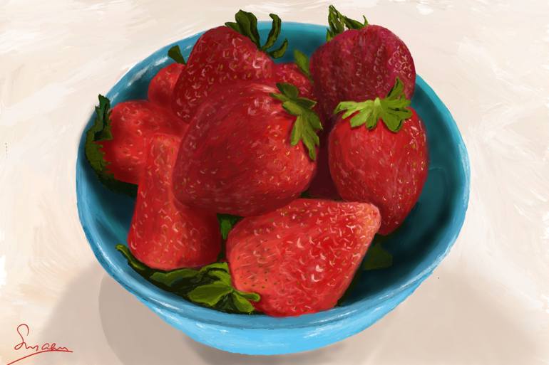 A digital still life painting of strawberries in a bowl, done in an oil painting style. The original digital painting is printed on a premium quality canvas using high quality inks and is stretched and stray-laminated and ready to hang. It is also personally signed at the back. The making of this ...