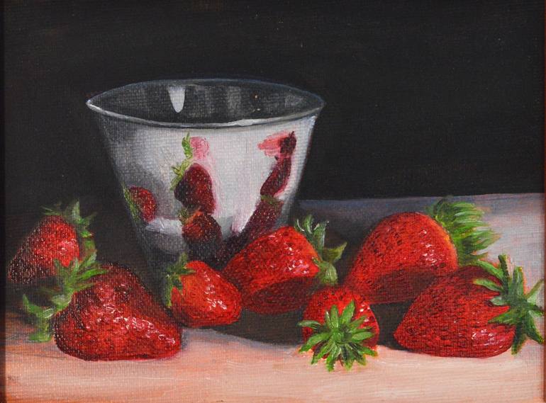 Oil painting on canvas mounted on board. One of a kind artwork. Still life with strawberries and a silver glass, chiaroscuro oil painting in realistic style. This painting is sold framed and ready to hang. Framed sizes: 21,50 cm. x 17 cm. deept 1,50 cm. Signed on the front, sent with a certificat...