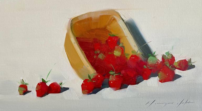 Artist: Vahe Yeremyan Work: Original Oil Painting, Handmade Artwork, One of a Kind Medium: Oil on Canvas Year: 2022 Style: Impressionism, Subject: Strawberries, Size: 9.5" x 17" x 0.8'' inch, 24x43x2 cm, Unframed, Stretched on Wooden Bar, Gallery Wrapped, Ready to Hang. Yeremyan is an Americ...