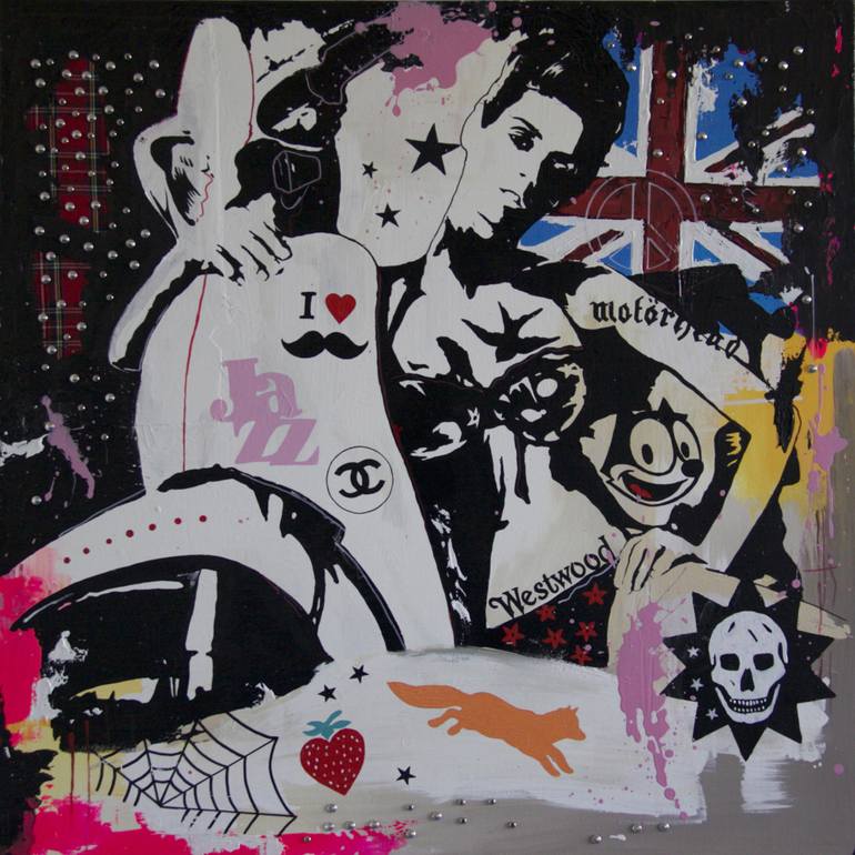 A striking popart collage style painting embellished with tartan material and metal studs for a rock and roll touch. The sides of the canvas are painted black, so no need to frame.