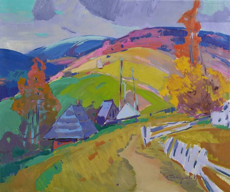 A vibrant landscape features rolling hills with multi-colored slopes under a cloudy sky. Small cottages with triangular roofs sit amid autumn trees, and a winding path lined with a white fence leads the eye into the distance. Alexander Shandor is an Ukrainian artist, who was born in 1981. He is pre...