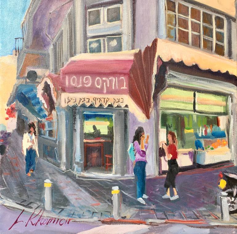 Street cafe in Tel Aviv, original oil painting made with a professional oil paints, 2021