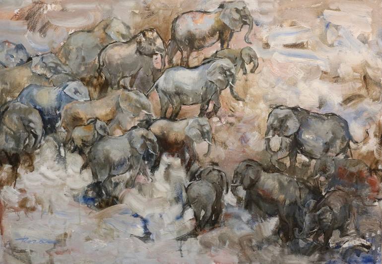 "Strength Symbol" captures the essence of collective strength and quiet determination. The impressionistic oil painting depicts elephants moving as one, symbolizing unity and resilience. It's a celebration of inner power found not in dominance, but in togetherness. This impressive, large painting i...