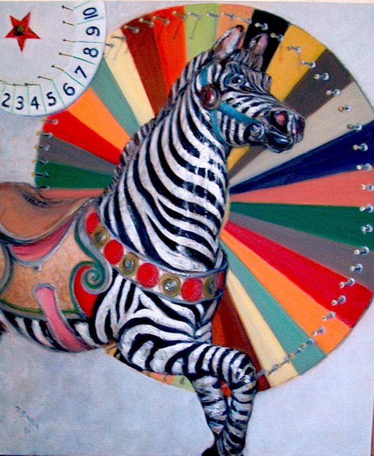 Oil painting of old merry-go-round horse with game-of-chance wheels in the background.