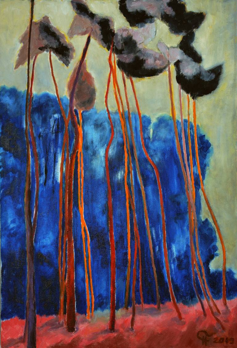 These were actually young larches with very thin and tall sunlit trunks. I have transformed them into butterfly-like things lightly sitting on bright orange spaghetti stems that wobble to reach something high up. Painted on plein air.