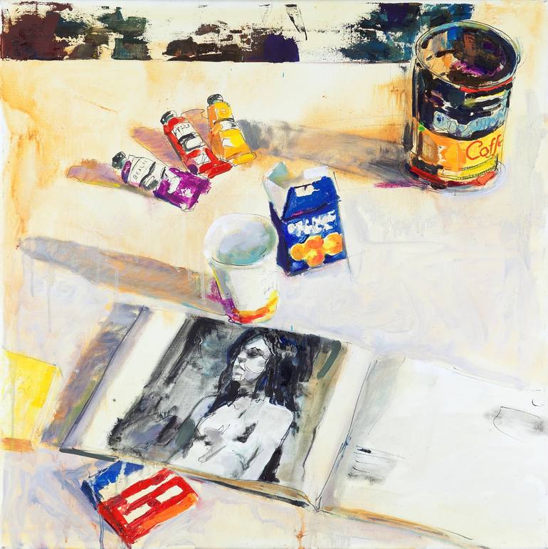 From a series of still lives of studio bric-a-brac, tools, paint tubes, books, models and images of art.