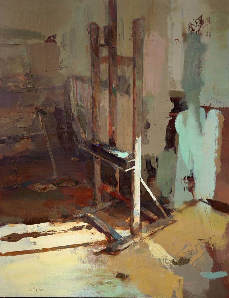Studio corner series The light that enters through the window lits the studio space creating a shadow and reflection warm atmosphere Oil on wood, not framed painting
