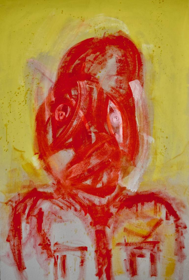 On raw canvas, face within face the artist sees, scraping brush of acrylic layers meeting into stressed strokes...