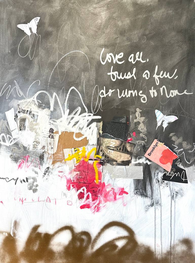 Inspired by NYC surfaces, infused with positive words this painting is available for purchase. Created with oil, spray paint, acrylic, paper it is sealed with a protective varnish and ready to hang.