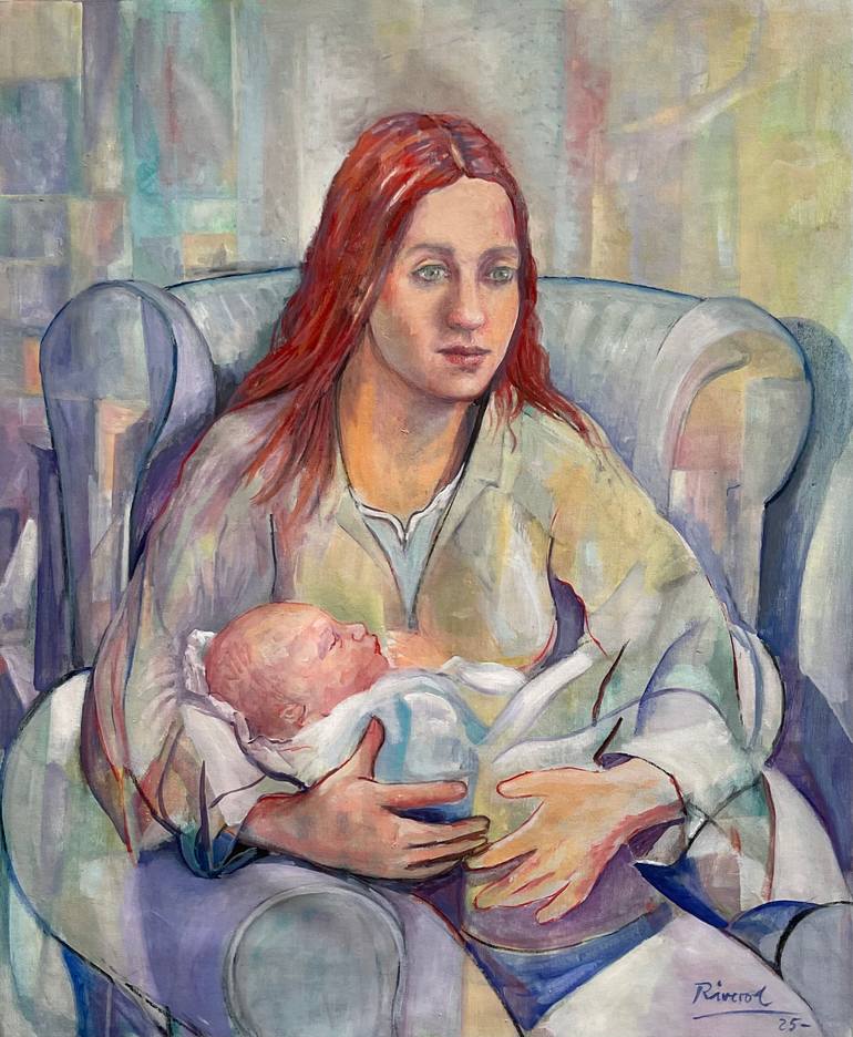 “Sueño y vigilia” captura la intimidad de un momento suspendido entre la ternura y la introspección. La figura materna, sentada en un sillón que la envuelve como un refugio, sostiene al niño con una delicadeza que contrasta con la lejanía de su mirada. La atmósfera, construida con pinceladas fragmen...