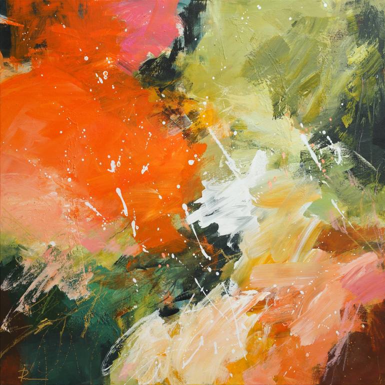 Materials: Stretched canvas, Acrylic and Oil Pastel Sides: Painted as a continuation of the motif Frame: Unframed, further framing possible but not necessary. Varnish: Silky finish with UV protection Signature: Front and verso, also signed Certificate of Authenticity The work will be shipped stretch...