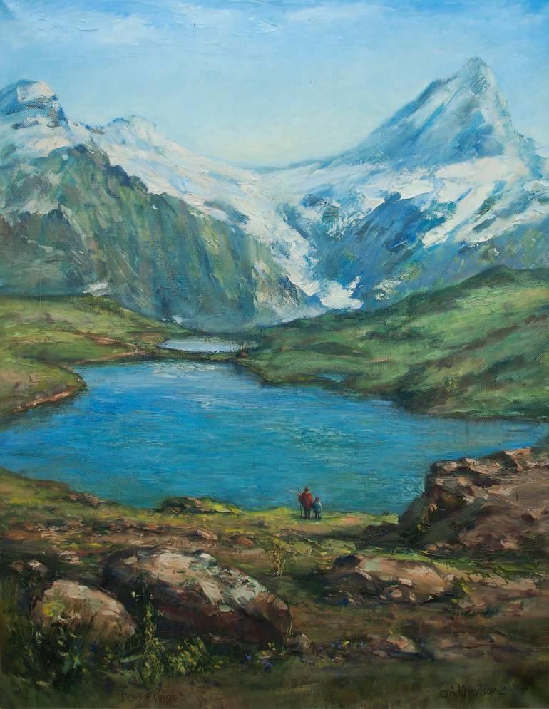 Inspired by trip to Swiss Alps. Snow-capped peaks. Mountain lake
