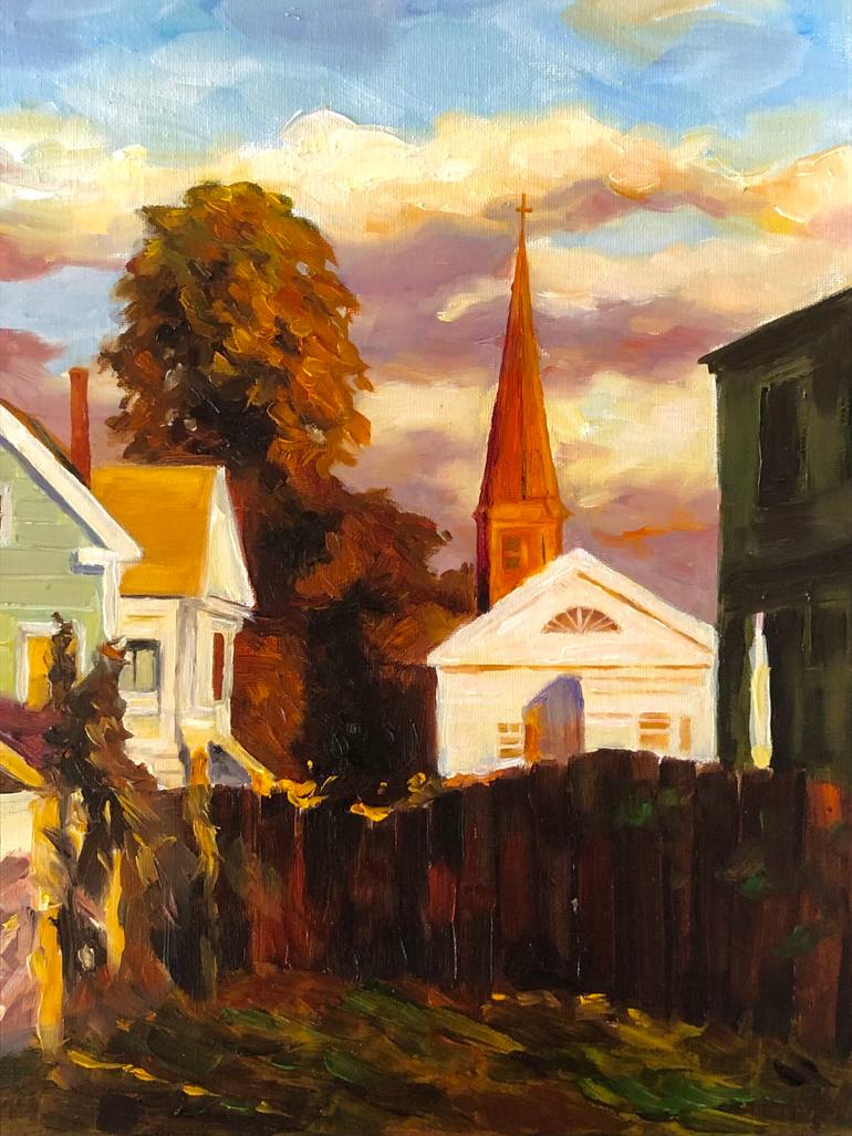 I wanted this painting to convey the feeling of a lazy summer afternoon, of lounging in a backyard and gazing into the neighborhood. Sunlight filters through a nearby tree, casting shadows…a church sounds in the distance.