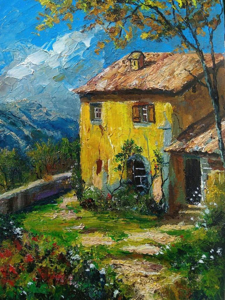 This stunning handmade art piece on canvas measures 15.7 inches in height and 11.8 inches in width. Created by the talented artist Sasha Brisac, this painting features a beautiful blue sky with clouds, majestic mountains, a lush landscape, and a charming little house. The summer theme is perfect for...