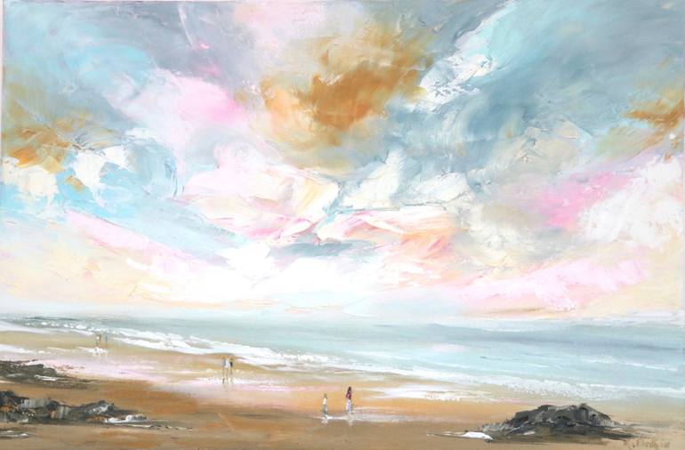 Inspired by the warm summer days on the beach. People enjoying the freedom and fresh air at their local seaside towns. Skies that smoulder and float. I wish to convey a sense of calm yet joy at being alive and well given the times we are in!