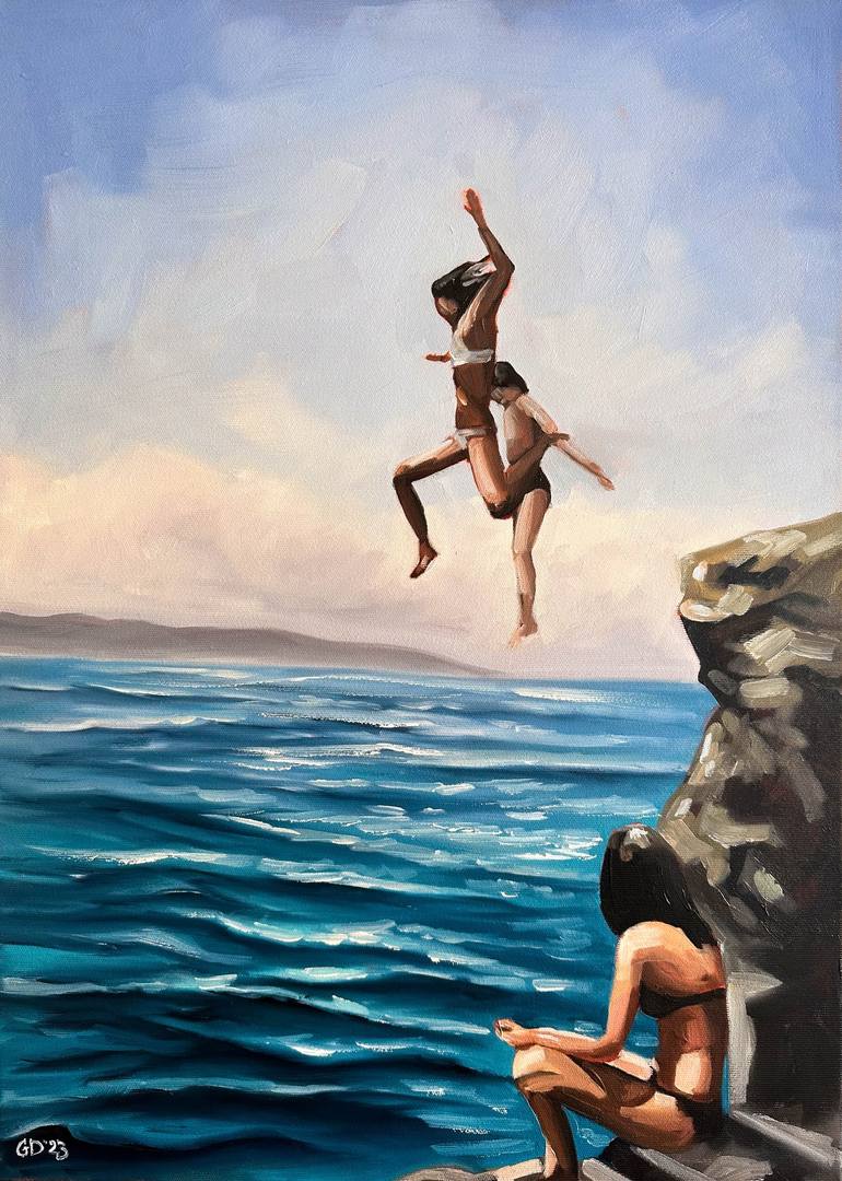Title: Summer Diving I wanted to convey the atmosphere of the carefree summer days of summer. It's a time for reckless acts and fun. The painting is painted with a flat brush, the undercoat is made in warm colors that shine through. This is an incredible shine effect of the painting! The work is pai...