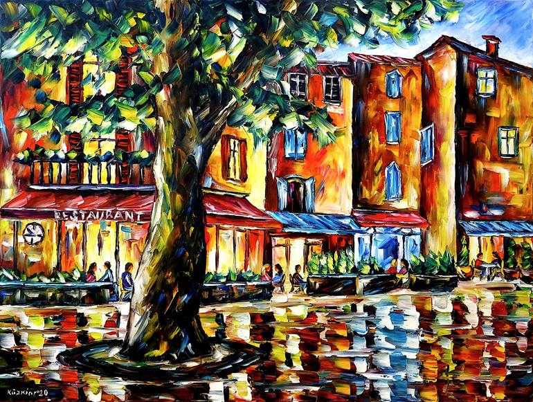 Colorful evening scenery of the village of Gordes in Provence, southern France. A modern art direction in palette knife technique by Mirek Kuzniar. Oil painting on canvas with certificate of authenticity and signed on the front and back. Professional stretcher made in Germany, made of softwood. Cove...