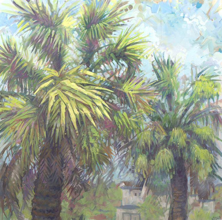 Varnished with a slight, satin finish. The canvas is unframed, ready to hang from d-rings installed on back. White canvas edges. This bright, saturated painting conveys a tropical sense of summer. The enormous palm bristles against the blue sky with colorful accents and texture. Had a great time p...