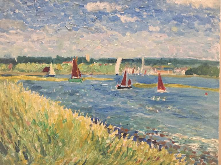 Summer on the river bank.The tide is coming up,and with it the wind ,on a fine Summers day enticing the sailing fraternity as they tack around the entrance to Woodbridge.Paint the river in shades of blue and green,the white wake of a passing boat,the lapping waves ,the grasses on the bank in greens ...