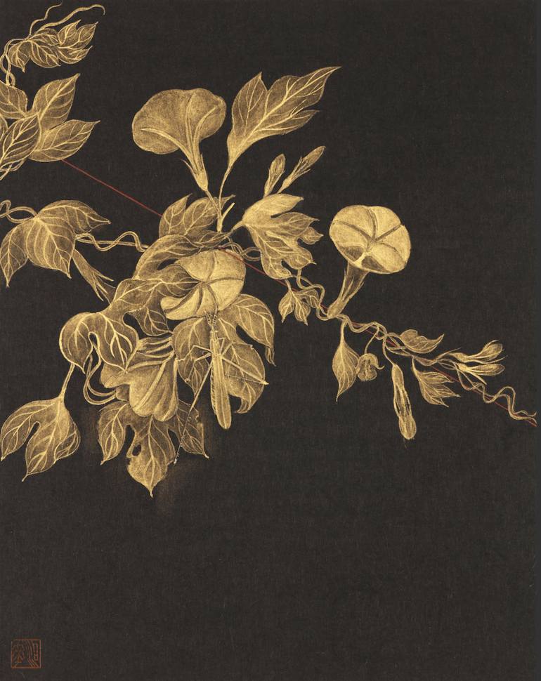 ....(omit) when I paint with Gong-bi-Wha technic gold on dark paper, it's an assignment for me not to brush marks. Big flowers which painted by mixed glue with gold powder, like a lotus, a big grape leaf, and grapes. with a meaning of auspicious, like I wish some good energy comes into my house, ...