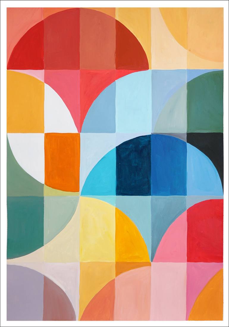 This abstract geometric acrylic painting is a vibrant and playful composition that draws inspiration from vintage Italian parasols. With a focus on bold, bright colors and clean lines, the painting features intersecting shapes and patterns that evoke the cheerful, summery vibe of a day spent loungin...