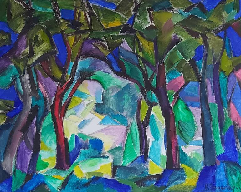 In summer, when it is hot, people look for coolness in the shade of trees. I wanted to express this feeling of cool air freshness in hot weather. Therefore I used blue, lilac,emerald colors, which symbolize coolness and at the same time are characteristics of impressionist painting. The picture was ...