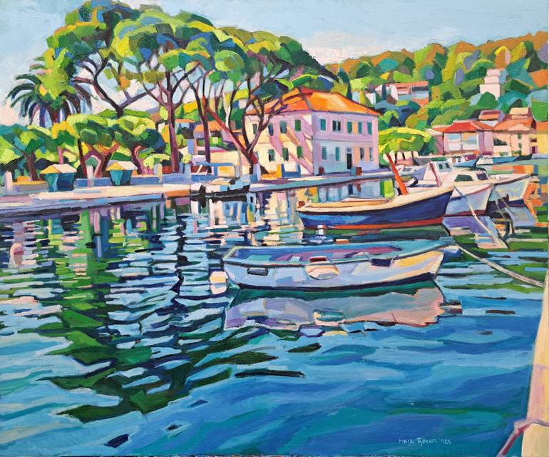 The seascape "Summer Day in Jelsa" depicts a calm, sunny day in Jelsa, a small town on the island of Hvar. A lonely building on the waterfront surrounded by Mediterranean greenery is mirrored in the sea, and anchored fishing boats depict the desolation of a hot summer afternoon.