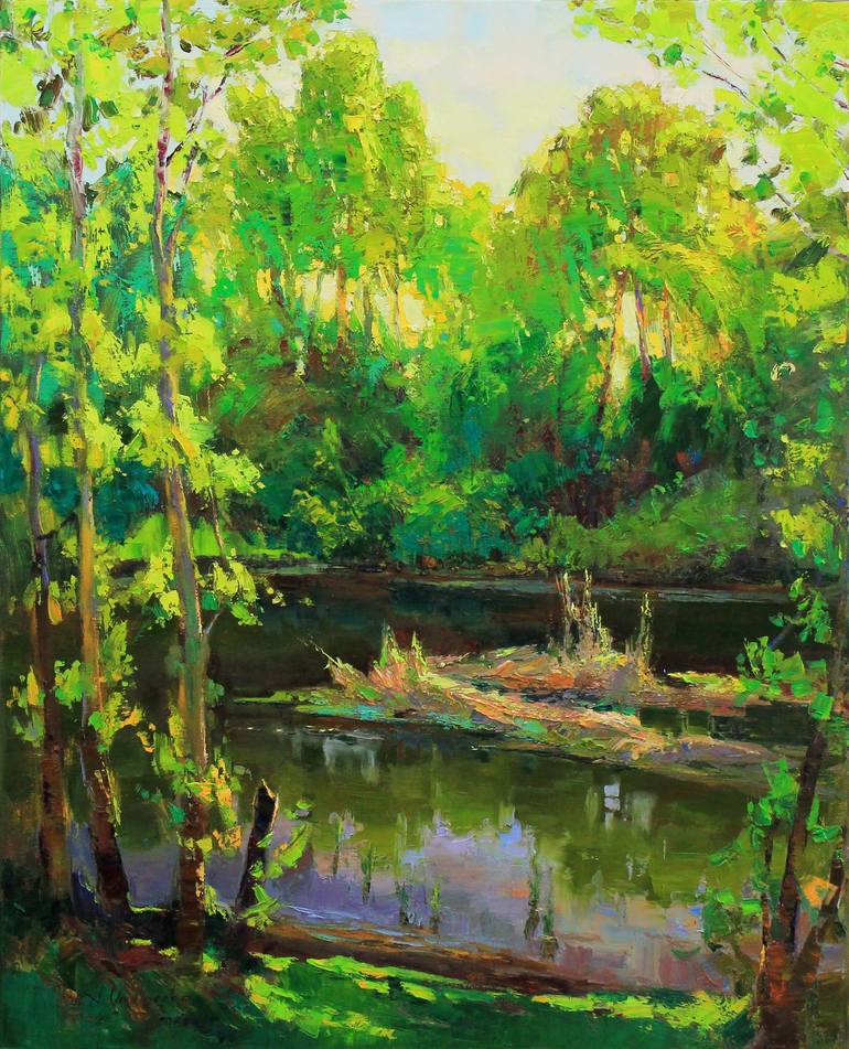 Original Impressionism Oil painting by Ukrainian artist Alisa Onipchenko-Cherniakovska Summer landscape with river of medium size in bright green and yellow colors. The picture conveys the warmth, mood and atmosphere of a sunny summer day. The vibration of light and shadow is depicted in an impressi...