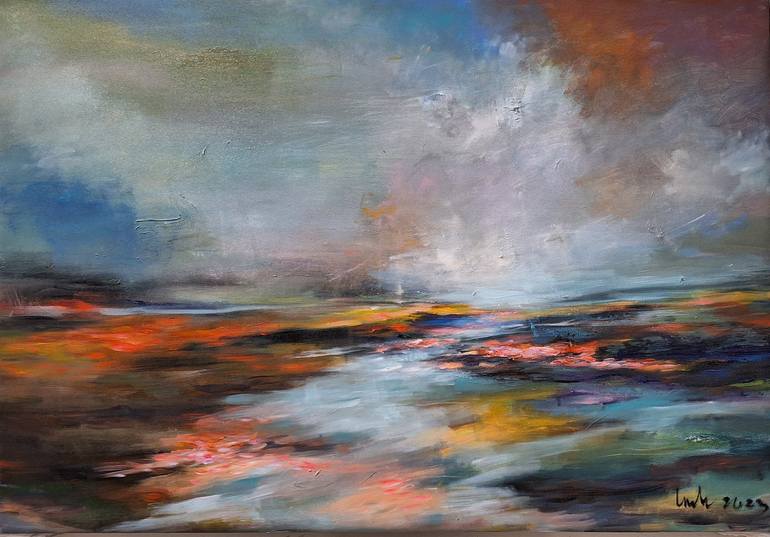 Sky in summer morning, landscape view the sea far on the horizon, impression, reflection, morning feeling, clouds, ground, atmosphere..... Abstract landscape painting, good acrylic material, with glue covering the surface. Can be hung immediately