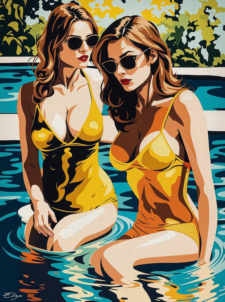 A hot afternoon in the pool, a talk between two women, relaxing summer day. A pop art paradise with this captivating painting, summer colors and clear lines bring to life a typical summer day at the pool filled with laughter leisure and conversation. As two women relax and chat the viewer is drawn ...