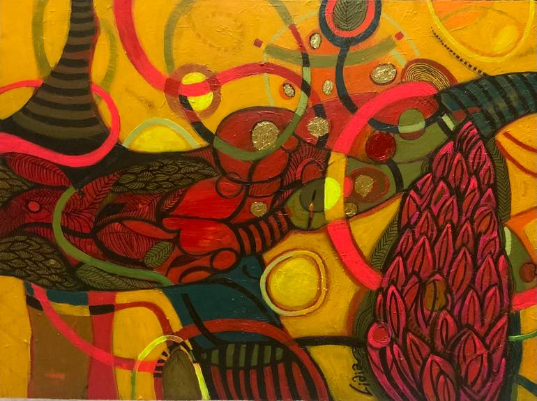 Colorful abstract art, influenced by summer glows, adventures and emotions . Multilayered acrylic painting on canvas, signed by the artist